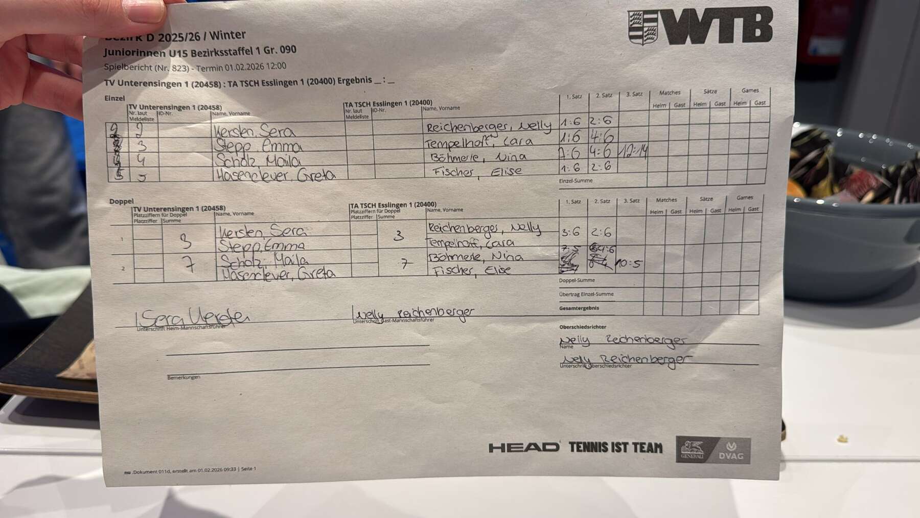 Am vergangen Sonntag traten unsere Mädels in Unterensingen an. Alle 4 Einzel konnten gewonnen werden. Nelly, Lara und Elise gewannen deutlich in 2 Sätzen. Nina kämpfte über 2 Stunden und konnte sich über einen Sieg mit 14:12 im Match-Tie-Break freuen. Nelly und Lara gewannen das 1.Doppel wieder deutlich. Nina musste mit ihrer Partnerin Elise erneut in den MTB, dieses mal mit dem glücklicheren Ende für Unterensingen. Somit konnte die Heimreise mit einem 5:1 Sieg im Gepäck angetreten werden. In der Tabelle sind wir auf den 3. Platz geklettert. Super Mädels, weiter so💪