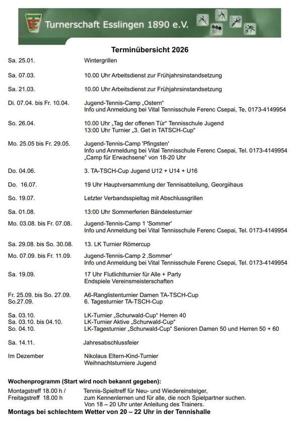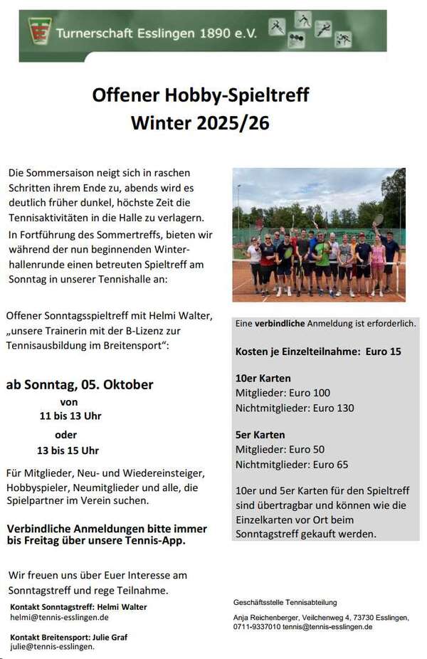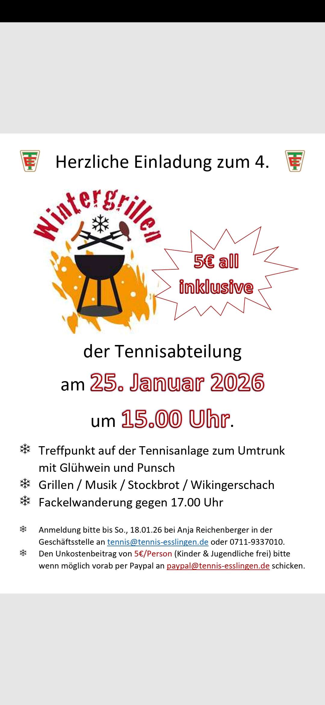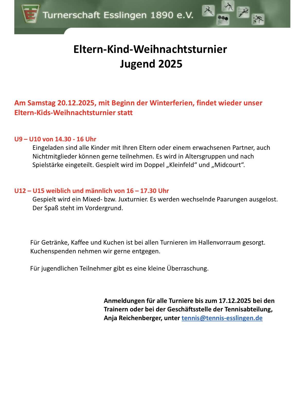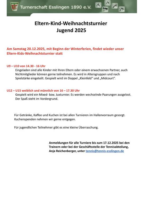 Anmeldungen bis 17.12.25 direkt bei den Trainern oder über die Geschäftsstelle unter tennis@tennis-esslingen.de